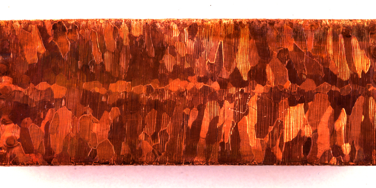 これは一般的な銅線の一種であるタフピッチ銅の断面の画像ですが、銅が固まる段階で次々と結晶が生成され、その結晶の境界面で様々な悪影響が発生しているようです。 音が良いとされているOFC (Oxygen Free Copper : 無酸素銅) も、構造的には同じですので、たとえ不純物が少なくなっていても、 導電率は低めで、音質的にも個性が出てきてしまいます。 |