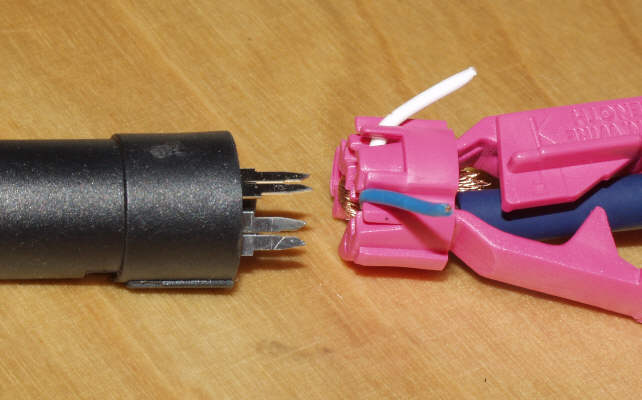こちらはごく少量のハンダが導線とコネクターのピンに薄くコーティングした ような状態で、ハンダ付けされています。撮影の関係でハッキリは見えない かもしれませんが、導線の縒りがハッキリ判るほど薄いハンダ付けです。 一見すると頼りなさそうに見えるかもしれませんが、イモハン状態よりは、 はるかに強固にハンダ付けされており、しかも、導線とピンが直接接触して いますので、音質的にも優れています。 基本的に、異種金属間同士の接触では電位差が生まれるため、それを 更に複雑にするイモハンは音質的に問題になるケースがあるようです。 上手にハンダ付けするには、コネクターのピンにハンダを薄く延ばしたような 状態にした上で、導線の方にもハンダをコーティングするように付けてから、 ピンと導線を一瞬でハンダ付けするというテクニックが必要です。 |